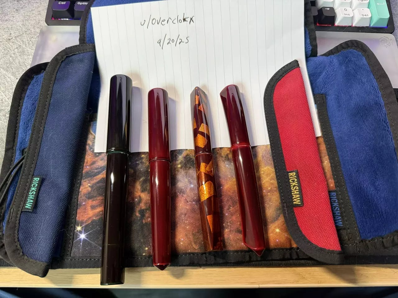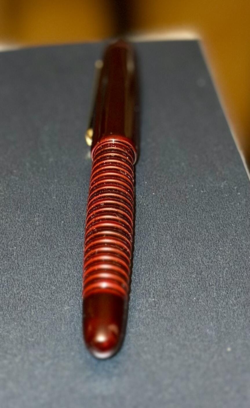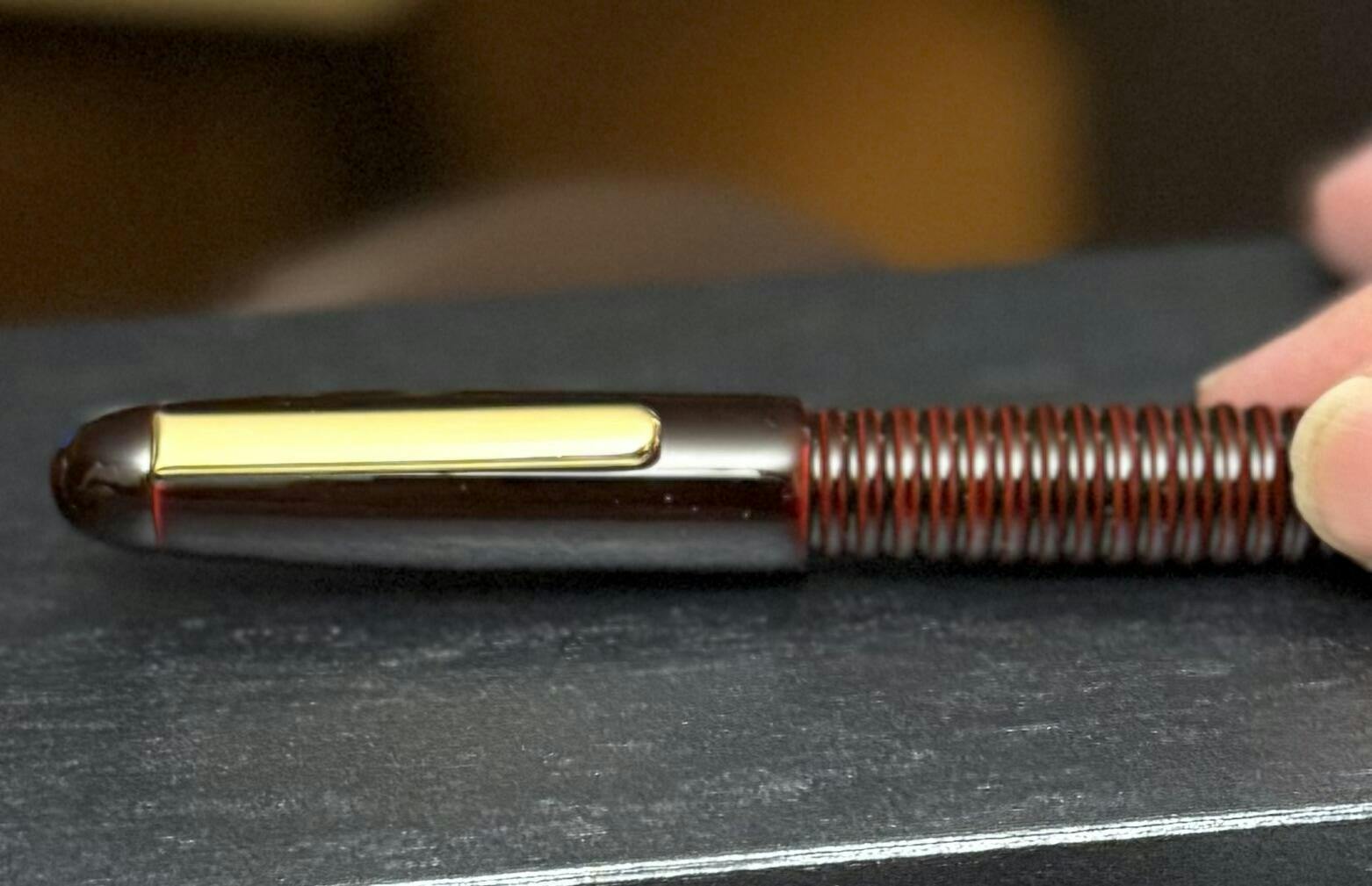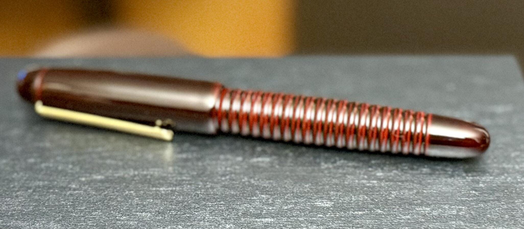 今回、エボナイト製万年筆にギャザード加工を行って溜塗を実施したオリジナル万年筆が完成しました。 ギャザード加工の凹凸により滑りにくいので手に持ったホールド感が増します。 また、ラジエターの役割もあるのでインクの耐久性を確保します。